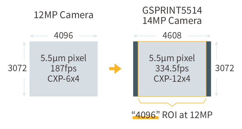 GSPRINT5514搭載の14MPモデルは5.5×5.5μm画素CMOSの為、水平方向の解像度を4608pxから4096pxに設定変更するだけで、市場で広く普及している12MPカメラと全く同じ解像度・光学サイズを実現します。既存の光学系はそのままに、さらなる高速化を可能にしました。