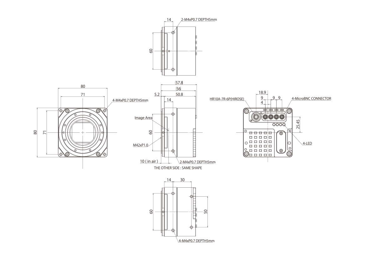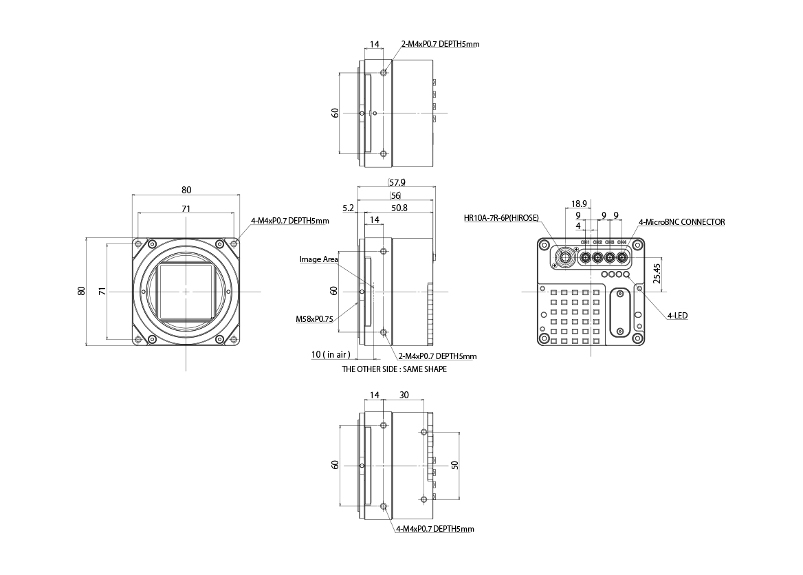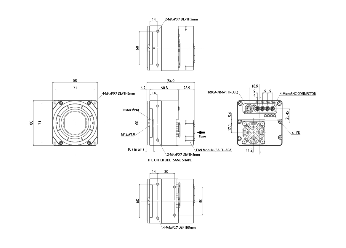 フロント面と4側面に取り付け用タップも装備しており、高速化・高画素化が求められるファクトリーオートメーションの各種用途に最適です。