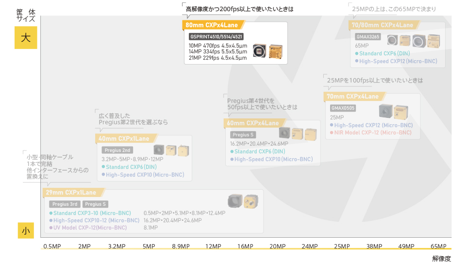4608×2176 | 4/3 | 4.5×4.5 | M42 / M58 / F | CXP-12 / -10 / -6 / -3, MicroBNCコネクタ×4 |