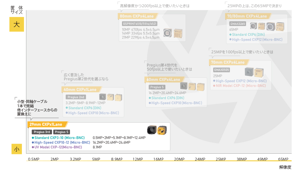 SONY社製Pregius第3世代/Pregius Sセンサーを搭載した29x29mm 1Laneカメラシリーズです。Normal Speedセンサー搭載のスタンダードモデルとHigh Speedセンサーを搭載したハイスピードモデルで合計32機種と多彩なラインアップを用意しました。CoaXPressカメラでは業界最小クラスの29mm角筐体でありながらCXP-12出力まで対応しており、高速性にも優れているので他インターフェースからの置き換えにも最適です。筐体上面・底面に取り付けタップを装備しており、1Laneコネクタ且つPoCXPに対応している為、配線ストレスを軽減すると共に設置環境への影響を最小限にします。