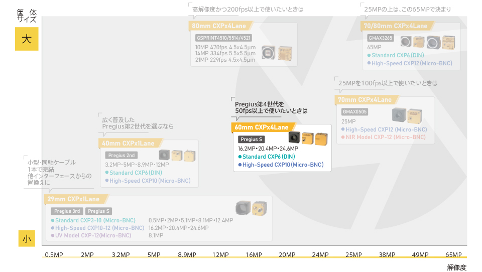 SONY社製Pregius S(16.2MP/20.4MP/24.6MP)センサーを搭載した60×60mm 4Laneカメラシリーズです。Pregius Sは SONY Pregiusシリーズの第4世代で、裏面照射構造により高い感度を維持しながら高解像度化を実現した新世代のセンサーです。60mm角のコンパクトな筐体設計で、高速・高感度・高解像度を兼ね備えており、優れた撮像性能を発揮します。汎用性の高いCXP-6×4レーンモデルとセンサーの最速フレームレートを実現するCXP-10×4レーンモデルを用意しました。コネクタ出し方向は背面(ストレートモデル)と上面(アングルモデル)から選択可能で、フロント面・4側面に取り付け用タップを装備しているので使用環境に合わせてご検討いただけます。